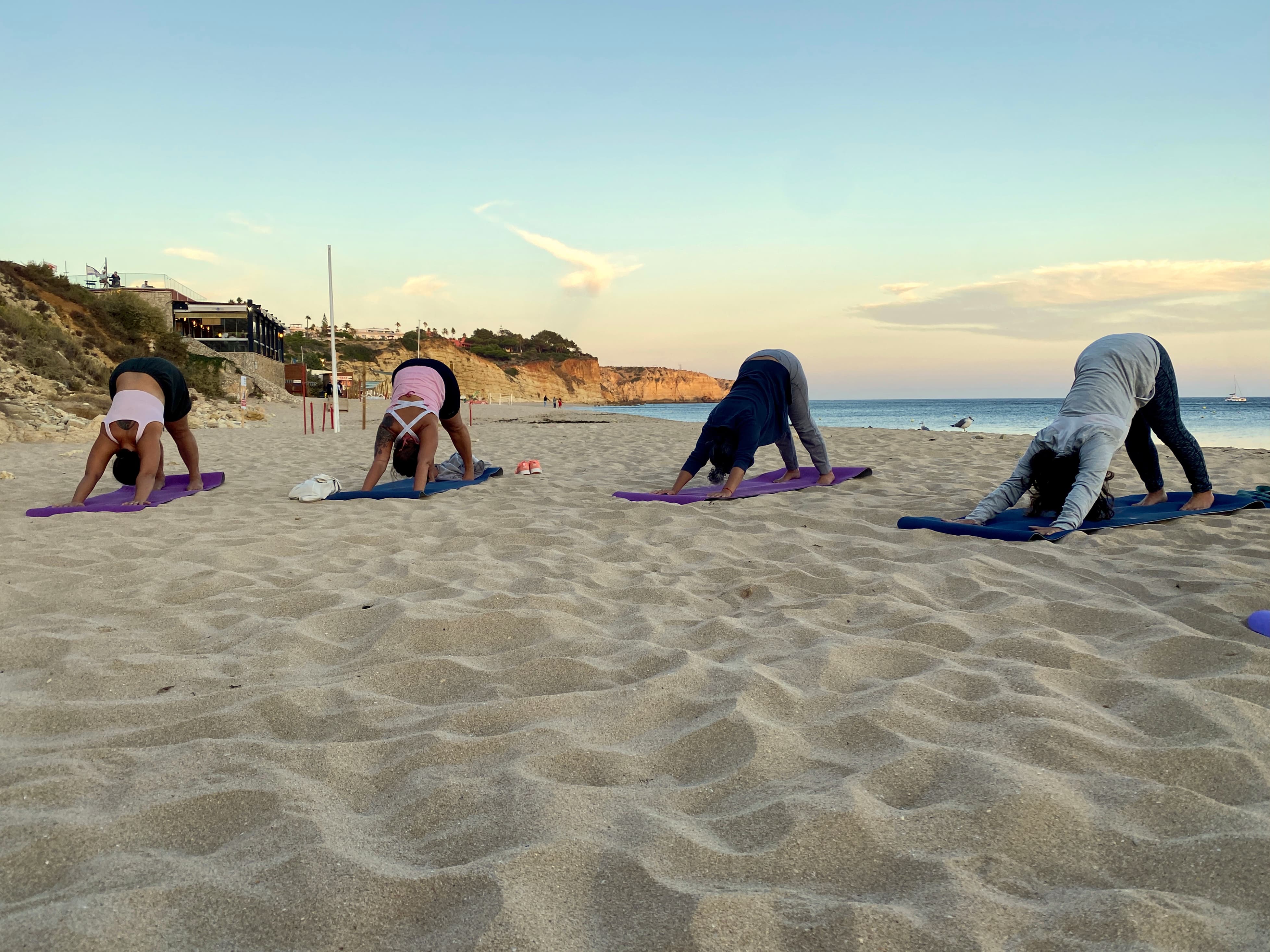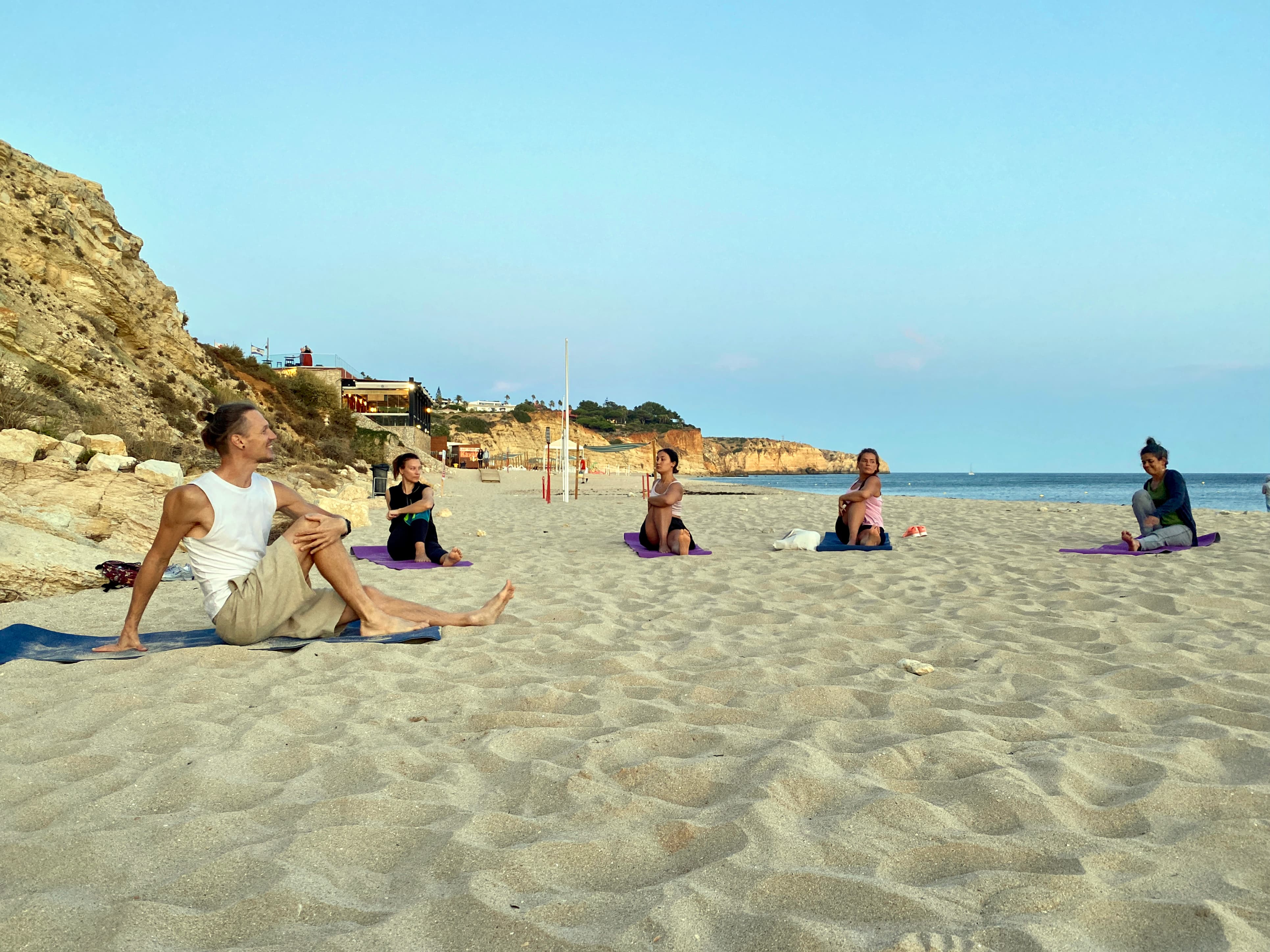 A must-experience beach yoga and live handpan music session by the ocean in Lagos, Portugal.