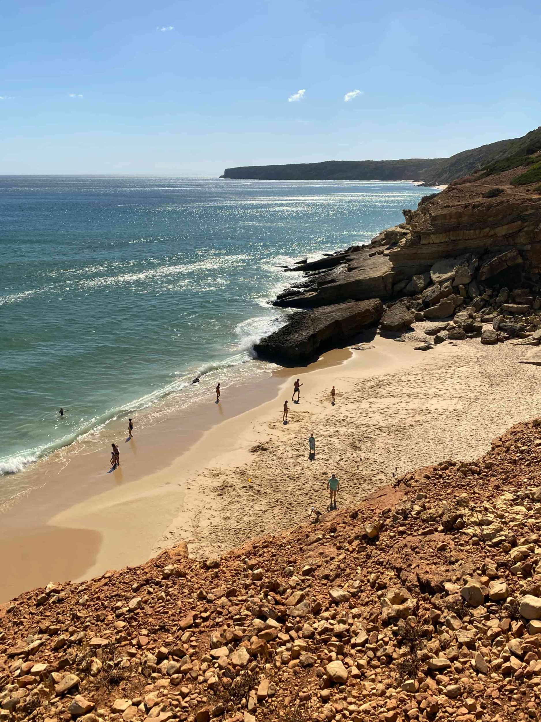 As we approach Praia da Figueira, the atmosphere becomes quieter and more secluded. This sheltered bay is framed by protective rock rises and the remains of Forte de Vera Cruz, a 17th-century fort once used to defend this stretch of coast from pirate incursions and maritime threats. We descend to the beach and take a short break. In summer, we sometimes take a refreshing swim before heading back.